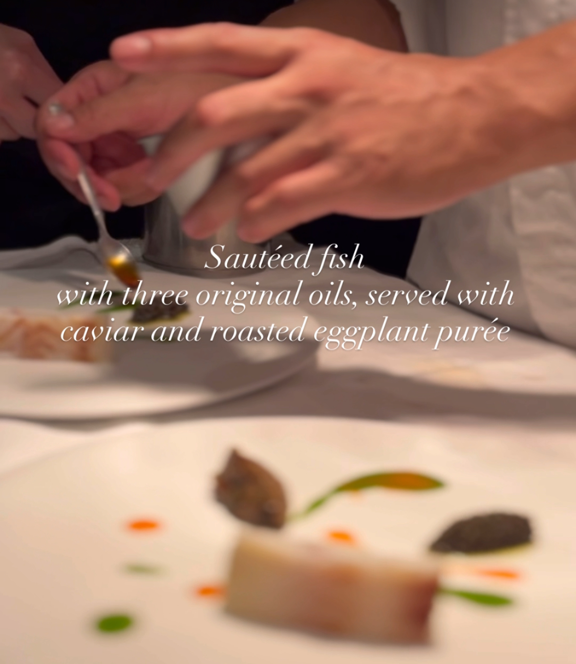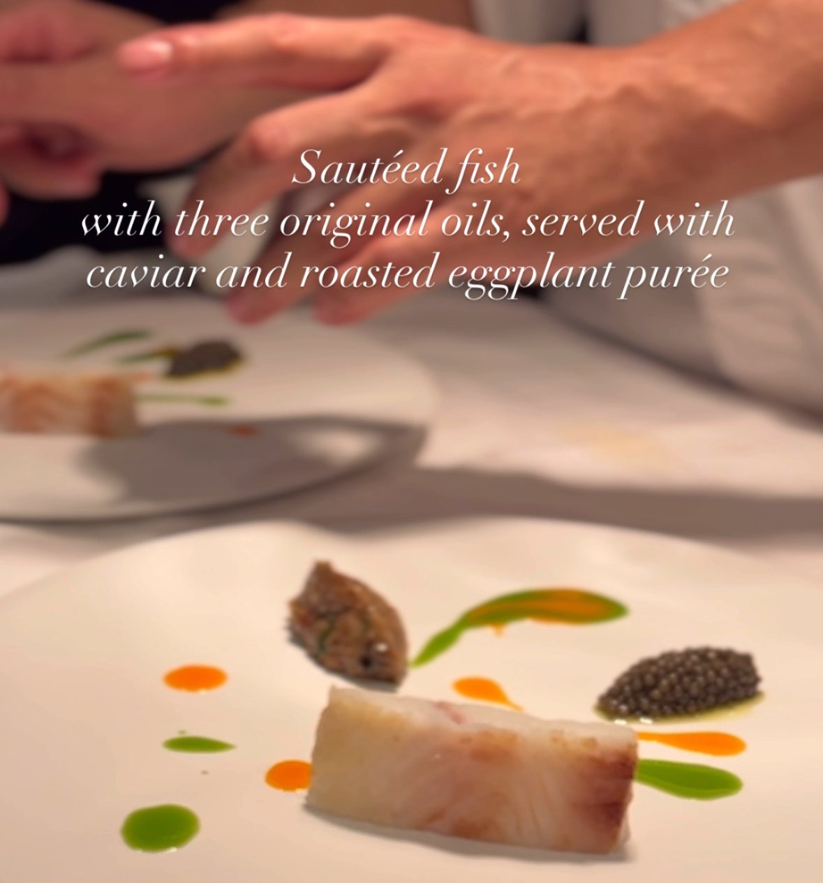 香ばしく焼いたナスのペーストであるキャビア・ドーベルジーヌや、塩気が柔らかなキャビアを添えて。